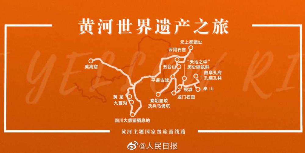 线路简介:黄河文化源远流长,黄河景观宏大壮丽,在流域沿线形成了丰富的自然和文化遗产。线路串联莫高窟、九寨沟、兵马俑、五台山、殷墟、泰山等黄河流域的世界文化遗产和世界自然遗产,让人们在领略自然之美中感悟文化之美、陶冶心灵之美,让旅游成为人们感悟中华文化、增强文化自信的过程。