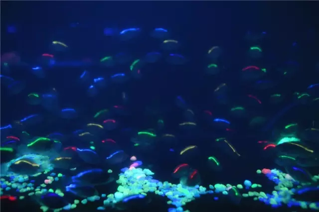 宽大透明的鱼缸内,一条条小鱼儿,竟然散发着红‘橘、蓝、绿等荧光色,看上去仿佛夜空中美丽的星光,十分梦幻。