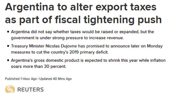 阿根廷财政部部长尼古拉斯-杜约夫(Nicolas Dujovne)已承诺,将在周一晚些时候宣布措施削减该国的2019基本赤字(即偿债前的借款需求)的措施,以努力遏制比索贬值。阿根廷比索已是今年全球表现最差的货币之一。
