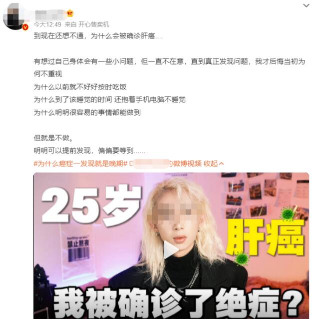 一位拥有554万粉丝的大V博主在微博上发了一段7分52秒的小视频,配上文案称,自己才25岁,就被确诊癌症,还是肝癌。