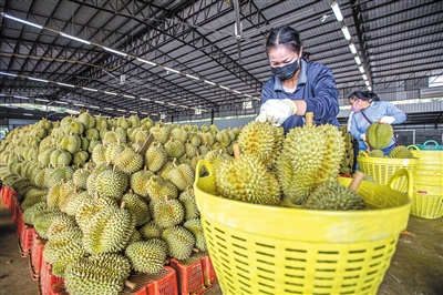 在泰国尖竹汶府一家榴莲分拣工厂,工作人员在分拣榴莲。王腾摄(新华社发)