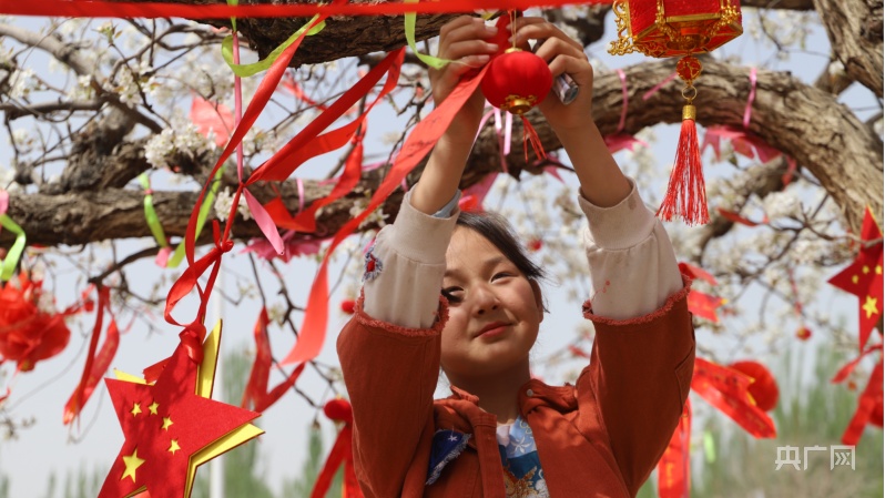 游客把红灯笼挂在梨花树干上(央广网发轮台县委宣传部供图)