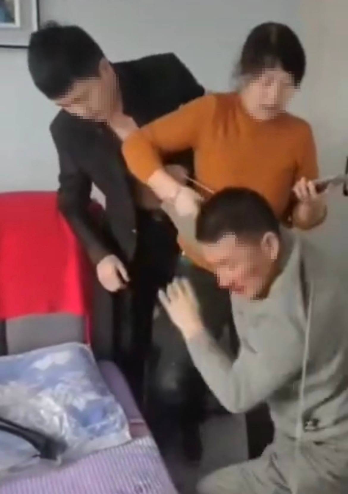 潇湘晨报记者注意到,视频中,一名身穿灰色衣服的中年男子跪在地上,口鼻处都是血迹,他紧紧拽住一名身穿黑色衣服的年轻男子的里衣,有气无力的喊着“别打了”。一名身穿橘色毛衣的中年女子系年轻男子母亲,阻挡在二人中间,多次试图阻止儿子动手。黑衣男子不断对灰衣男子进行辱骂,“给脸不要脸”、“畜生”……期间,他多次对灰衣男子拳打脚踢,甚至试图对灰衣男子的妻子动手。