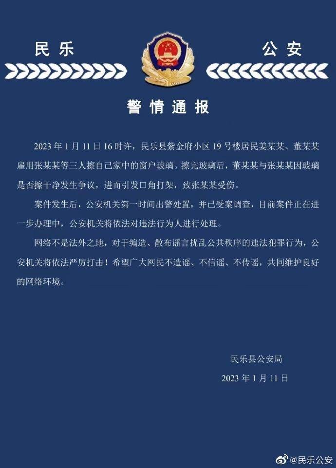 甘肃省张掖市民乐县公安局官方微博1月12日凌晨发布警情通报,称2023年1月11日16时许,民乐县紫金府小区19号楼居民姜某某、董某某雇用张某某等三人擦自己家中的窗户玻璃。擦完玻璃后,董某某与张某某因玻璃是否擦干净发生争议,进而引发口角打架,致张某某受伤。
