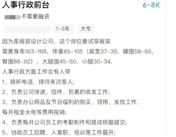 据报道,近日,有网友发文称,自己找工作时,发现某公司行政前台岗对身高、体重、肩宽、腰围、臀围等均有要求,像选美一样,引起广泛关注。
