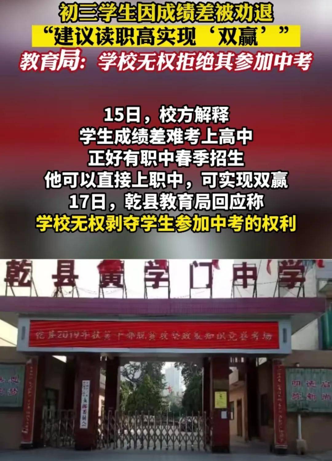 评判一个学校的好坏是什么,是学校的升学率。一个老师评判他的好坏是什么,是学生的成绩。一个学生的学习成绩不好,如果参加中考,必定拖累学校的升学率,老师学生的成绩。学校和老师为了自己的利益,他就会劝退成绩差的学生。