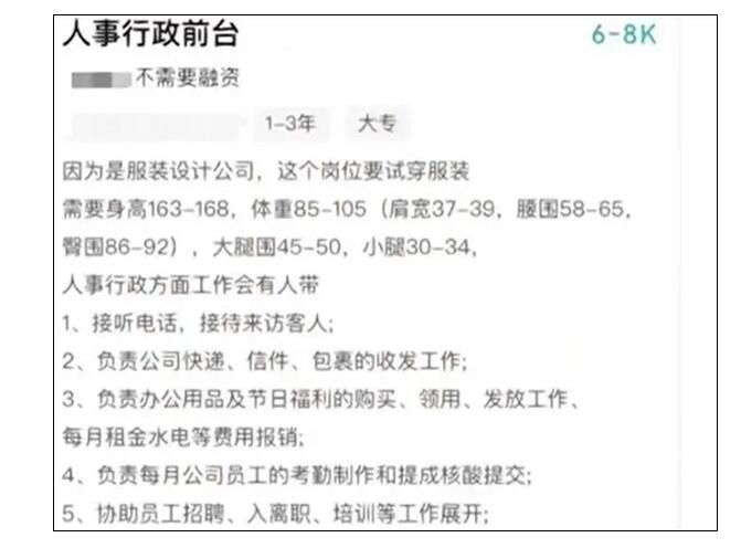近日,有网友发文称,自己找工作时,发现某公司行政前台岗对身高、体重、肩宽、腰围、臀围等均有要求,像选美一样,引起广泛关注。