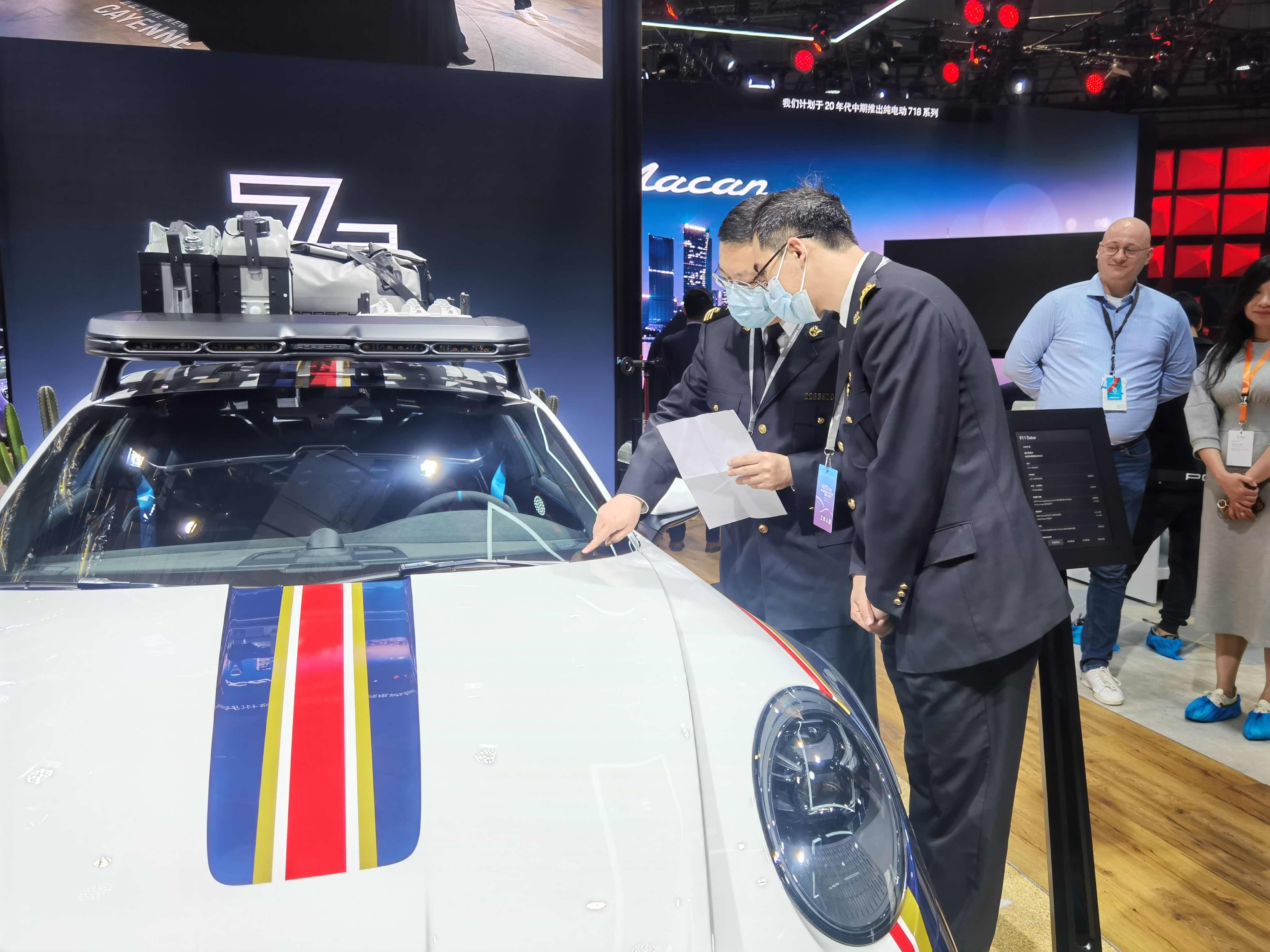 上海会展中心海关关员对2023上海车展进境展品进行现场监管