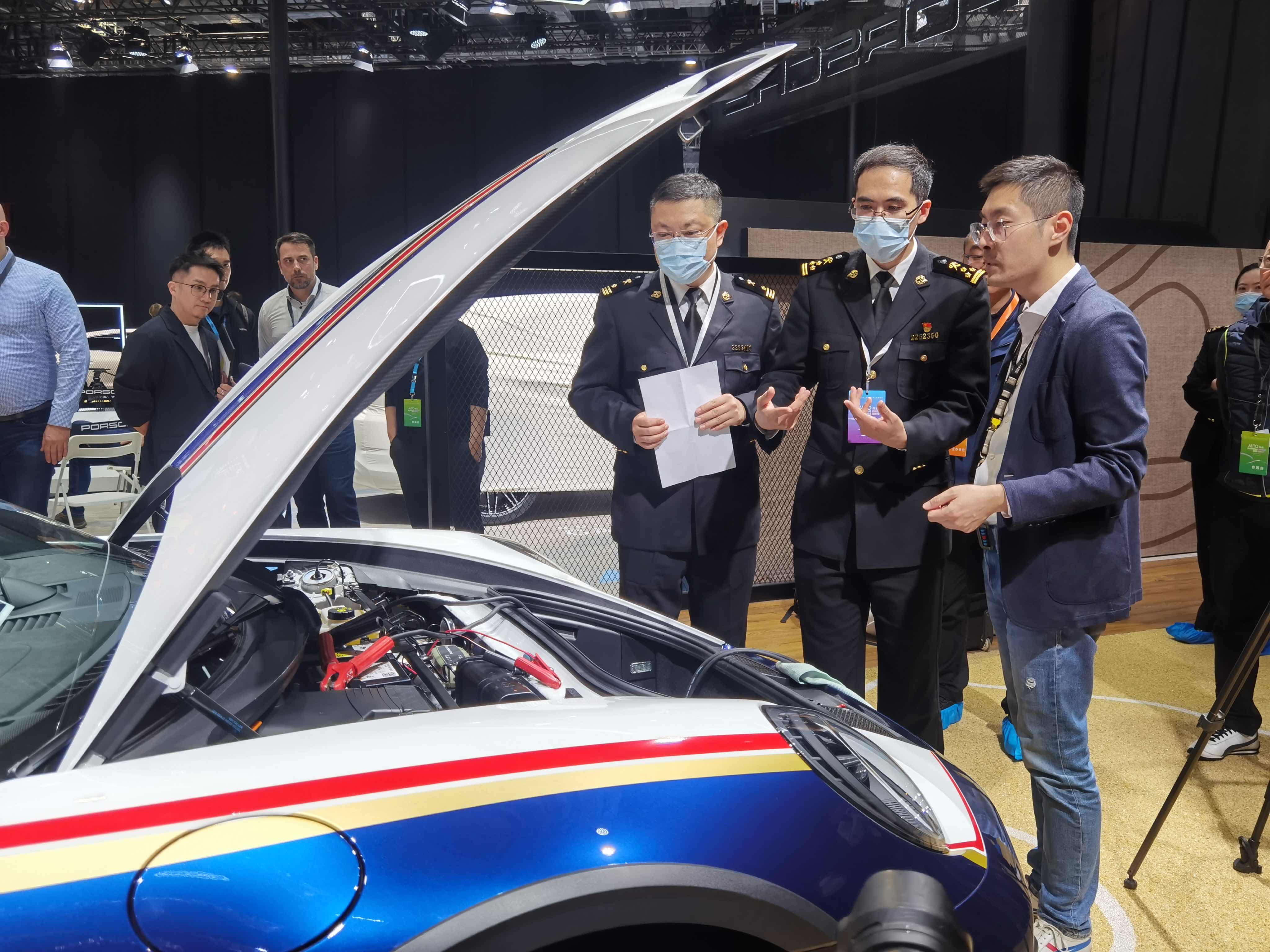 上海会展中心海关关员对2023上海车展进境展品进行现场监管。上海海关供图