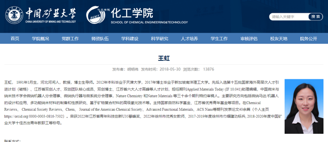 1991年出生的王虹是中国矿业大学化工学院教授、博士生导师。