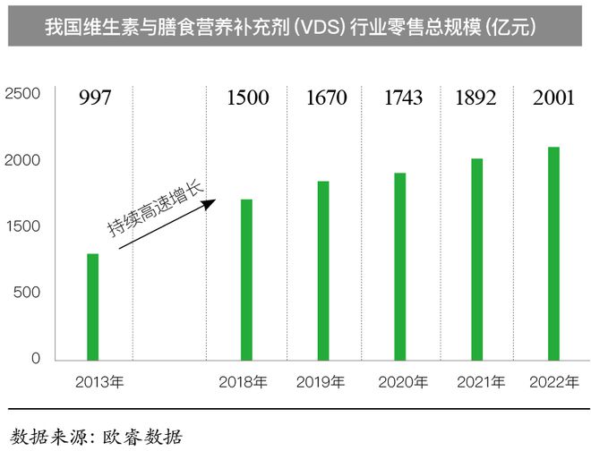 欧睿数据显现,2022年我国维生素与膳食养分弥补剂(VDS)职业零售总规划现已到达约2001亿元,相较疫情前的1670亿元增加了19.8%,相较2013年的997亿元增加了100.7%,增加力微弱。