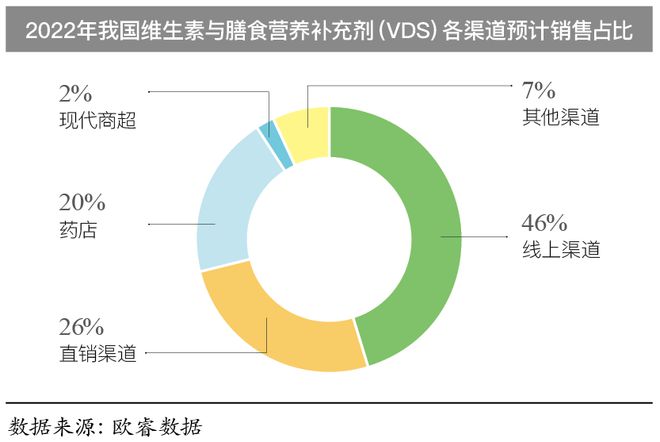 依据数据,2022年我国维生素与膳食养分弥补剂(VDS)途径结构继续改动,各途径估计出售占比别离约为:线上途径46%、直销途径26%、药店20%、现代商超2%、其他途径7%。