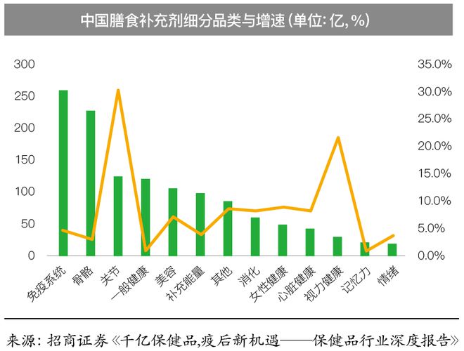 跟着维生素与膳食养分弥补剂(VDS)的高速开展,其细分品类的商场规划也在不断增加。依据招商证券发布的《千亿保健品,疫后新时机——保健品职业深度陈述》,现在我国膳食养分弥补剂(VDS)中占有较大规划的是免疫系统类、骨骼类和关节类产品,规划均在120亿元以上,其间免疫系统类的产品规划到达250亿元以上。