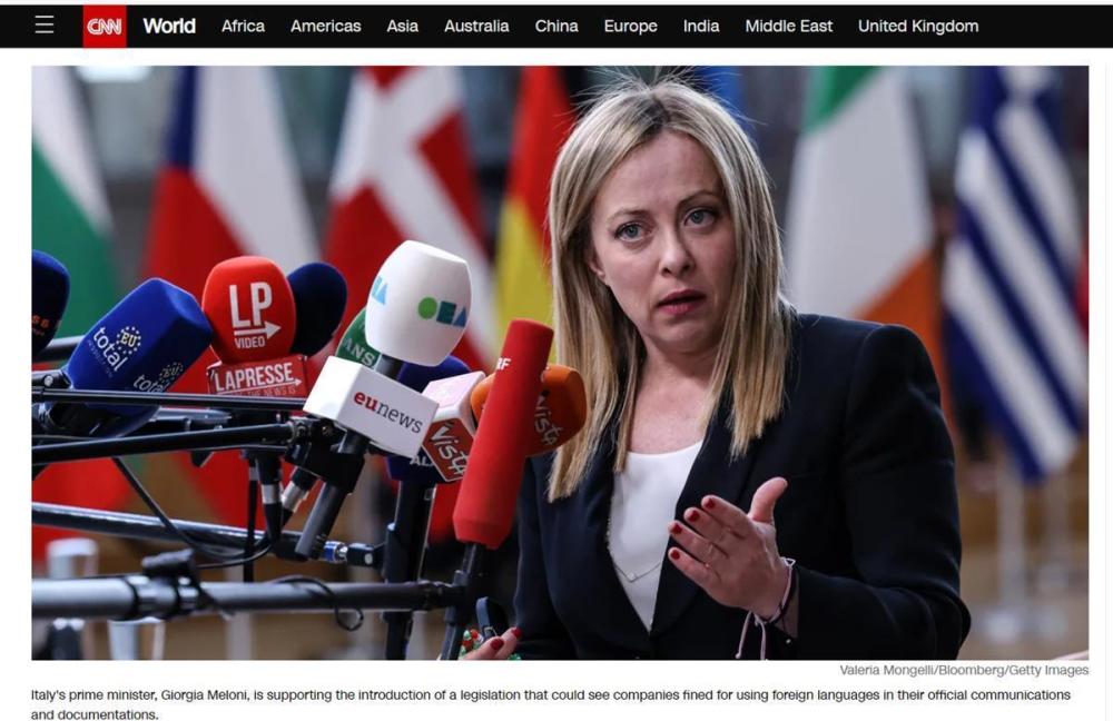 极目新闻消息,据CNN4月1日报道,近日,意大利执政党——意大利兄弟党向众议院提议,设立法律禁止使用外语,违反者最高罚款10万欧元(约合74.4万元人民币)。目前,这一立法提议已经得到了意大利总理梅洛尼的支持。
