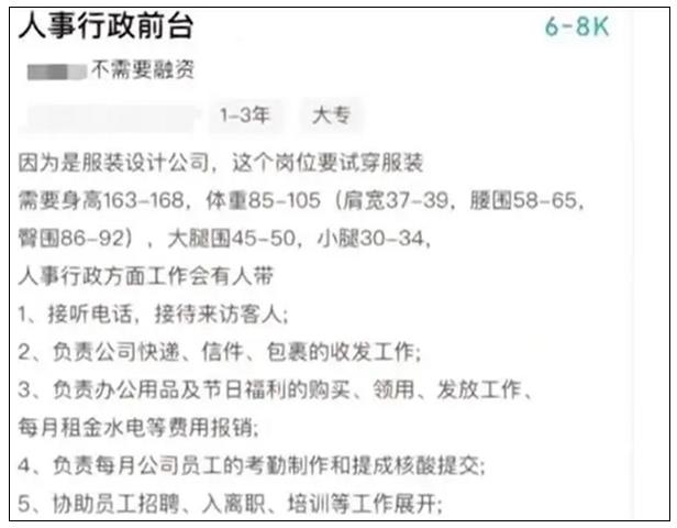 近日,有网友发文称,自己找工作时,发现某公司行政前台岗对身高、体重、肩宽、腰围、臀围等均有要求,像选美一样,引起广泛关注。