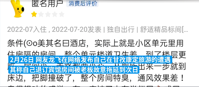 近日,有网友在短视频平台投诉康定一酒店,引发关注。网友龙飞告诉媒体,23日,自己在康定市祥驴酒店预订了四间房间,紧跟着看到大雪封山的提示路牌,便申请退房。他记得,前三间房间成功退款,最后一个房间因为接近五分钟的退房时限,商家显示在处理中,24小时内会给答复。没想到的是,次日,商家以房间保留了一整晚为由,拒绝给他退款。他找商家协商,反被恶语相向。