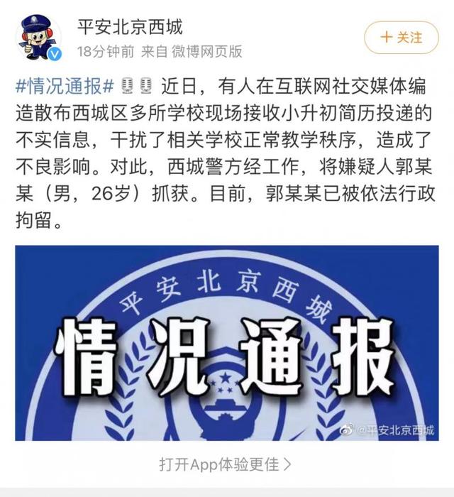 4月2日,据北京市公安局西城分局通报,近日,有人在互联网社交媒体编造散布西城区多所学校现场接收小升初简历投递的不实信息,干扰了相关学校正常教学秩序,造成了不良影响。对此,西城警方经工作,将嫌疑人郭某某(男,26岁)抓获。目前,郭某某已被依法行政拘留。