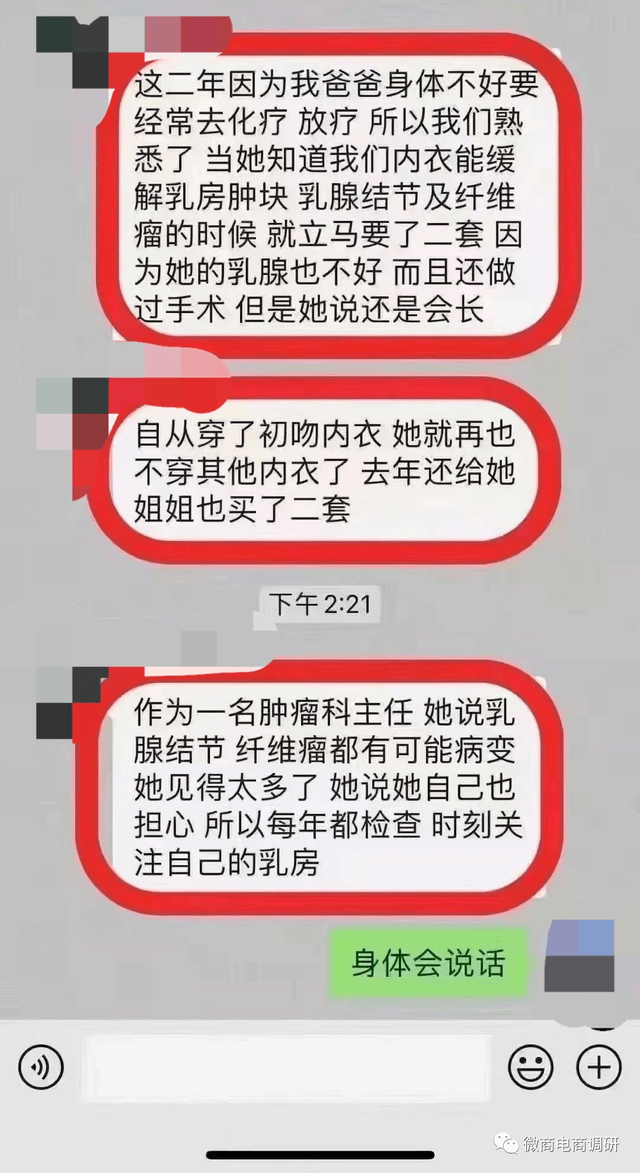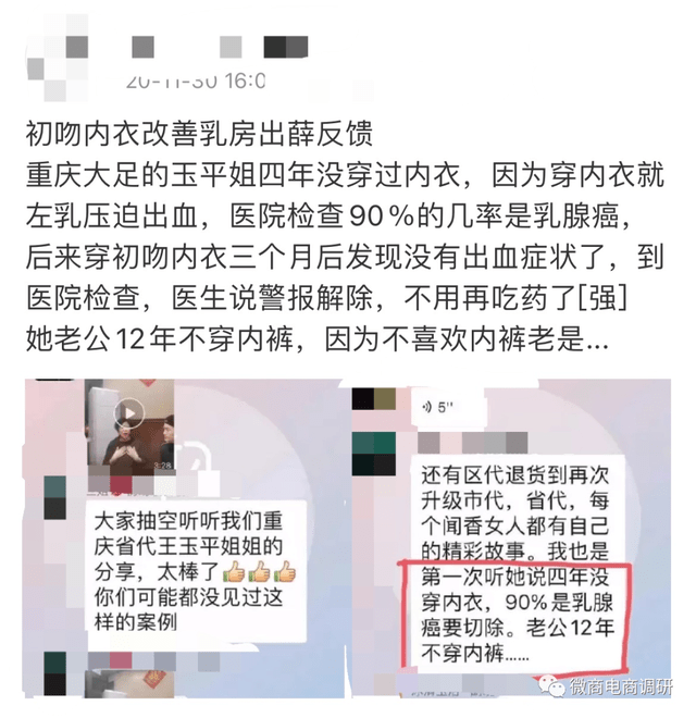 不只如此,在经销商的推行材料里,初吻还被称之为是一款可以缓解乳腺增生、结节、疏通乳腺,远离乳腺疾病的健康内衣。乃至还有许多使用者的事例:作为一名肿瘤科主任,在知道初吻内衣能够缓解乳房肿块、乳腺结节以及纤维瘤的时候,立马就给自己和家人买了两套,并从此再也不穿其他品牌的内衣。