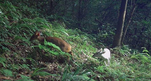 4月17日,湖北巴东,工作人员发现白麂和黄麂一起寻食的稀有画面。画面中,白麂与黄麂一前一后在密林的空位上行走,白麂通体洁白,头上顶着一对白色犄角,正在啃食青草。据悉,麂子以黄麂居多,白麂最为稀有,在我国古代曾被称为“瑞兽”。麂子喜欢茕居或许男女同栖,很少会呈现集体活动。