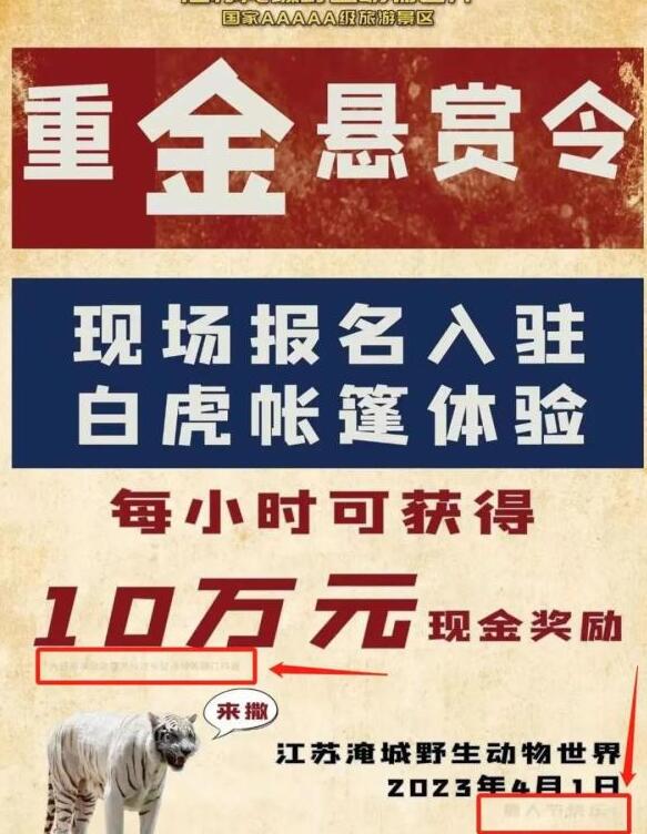 月1日,江苏常州,网曝江苏淹城野生动物世界是全球招募勇士和老虎同处一个空间一个小时10万。4月2日,该园发布公告称,因不可抗力因素暂停该活动。