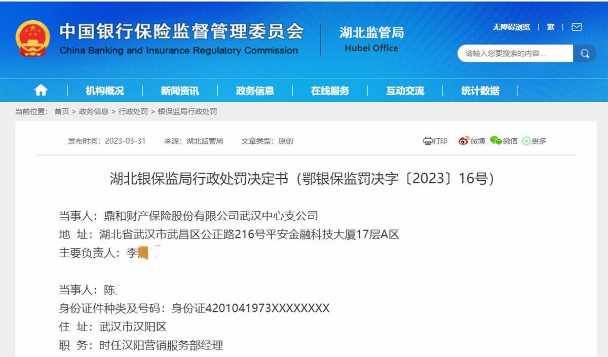 湖北银保监局决议对鼎和财险武汉中支予以罚款11万元的行政处分,决议对陈某予以正告并罚款1万元的行政处分。