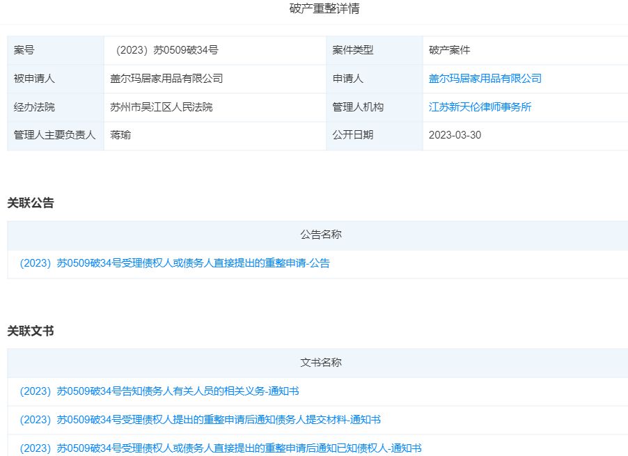 3月30日,天眼查显现:盖尔玛居家用品有限公司(以下简称盖尔玛公司)请求破产重整。