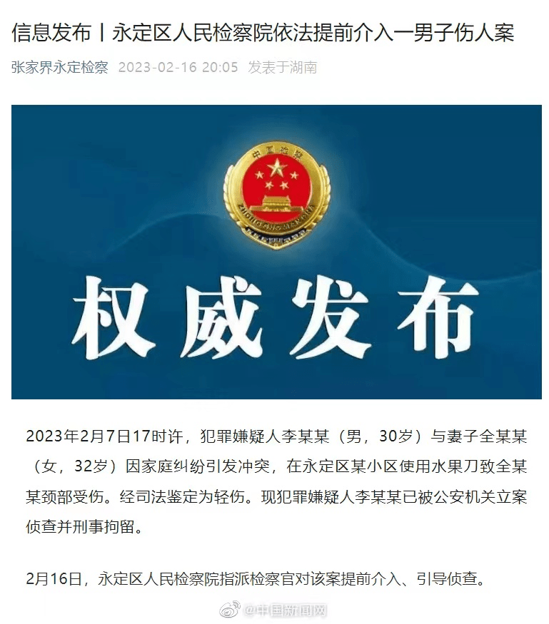 2月16日,“张家界永定检察”称,永定区人民检察院依法提前介入一男子伤人案。2023年2月7日17时许,犯罪嫌疑人李某某(男,30岁)与妻子全某某(女,32岁)因家庭纠纷引发冲突,在永定区某小区使用水果刀致全某某颈部受伤。经司法鉴定为轻伤。现犯罪嫌疑人李某某已被公安机关立案侦查并刑事拘留。2月16日,永定区人民检察院指派检察官对该案提前介入、引导侦查。
