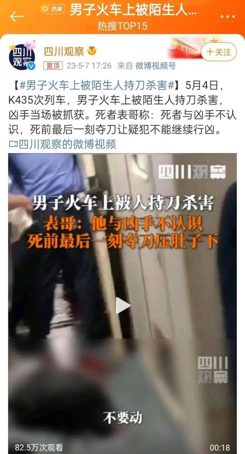 此前据四川广播电视台官方微博“四川观察”发布消息称,5月4日,K435次列车,一男子在火车上被陌生人持刀杀害,凶手当场被抓获。死者表哥称:死者与凶手不认识,行凶的刀有18厘米长,死前最后一刻还把刀抢过来压在肚子下面。
