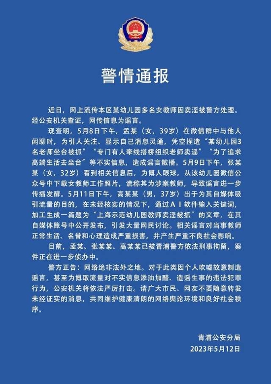 5月12日,上海青浦公安局通报,近日,网上流传本区某幼儿园多名女教师因卖淫被警方处理,经公安机关查证,网传信息为谣言。