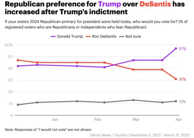 在支持率问题上,雅虎新闻/YouGov上周六发布的民调显示,如果特朗普与佛州州长、共和党新星德桑蒂斯在共和党初选中对决,有57%共和党选民和亲共和党独立派选民将投票给特朗普,投票给德桑蒂斯的选民占比骤降至31%。
