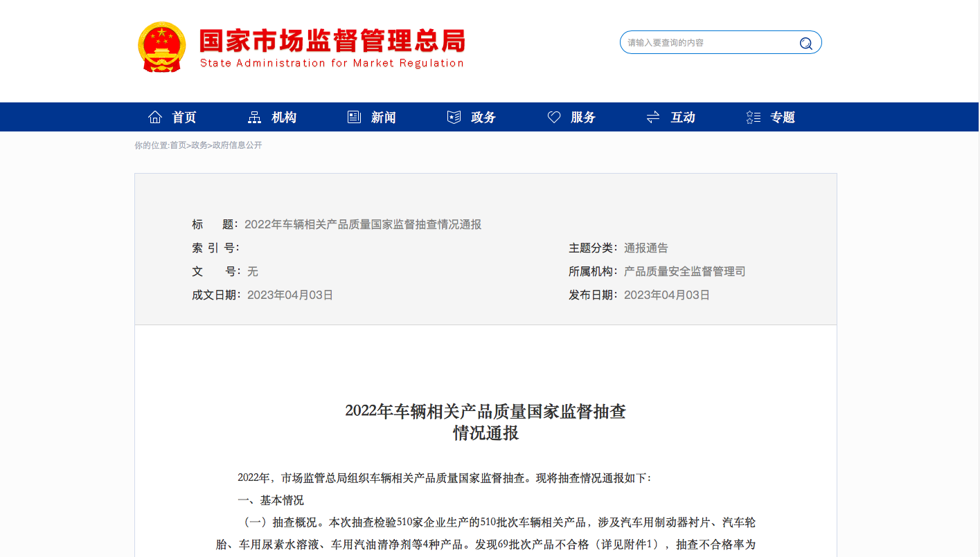 国家商场监督管理总局:2022年车辆相关产品质量69批次不