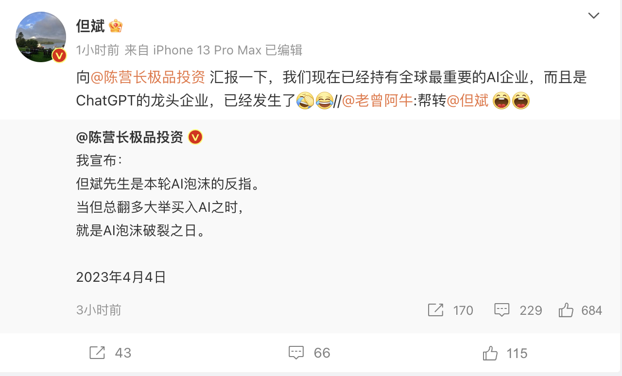 4月4日,但斌在其实名认证微博中表明:“我相信ChatGPT、人工智能代表未来,但其垄断性、开发运用本钱只会让极少量公司具有未来,这一波概念炒作一旦被套,不知道驴年马月解套!”