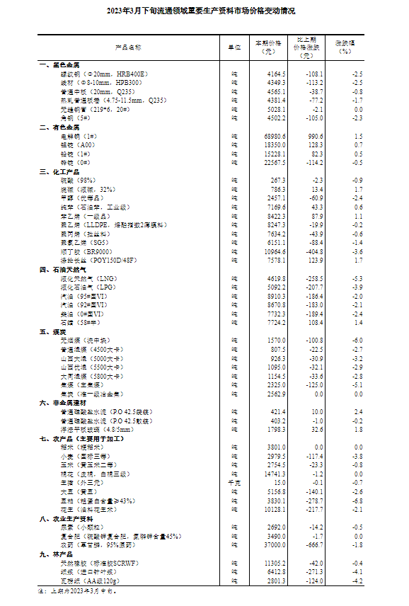 央广网北京4月5日消息国家统计局数据显现,据对全国流通领域9大类50种重要生产资料市场价格的监测显现,2023年3月下旬与3月中旬比较,10种产品价格上涨,35种下降,5种相等。其间,生猪(外三元)价格为15.0元/千克,环比下降0.7%。