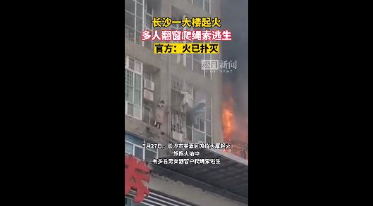 3月27日,湖南长沙。长沙市芙蓉区一大楼起火,现场有多名男女翻窗户爬绳索逃生。