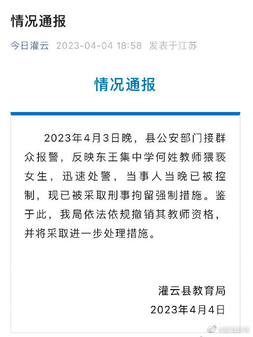 据灌云县教育局通报,4月3日晚,东王集中学何姓教师猥亵女生,当事人当晚已被控制,现被采取刑事拘留强制措施。教育局已撤销其教师资格,并将采取进一步处理措施。