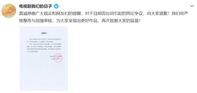 最终《我们的日子》官博发致歉信,承认错误,并且表示修改替换相关片段。