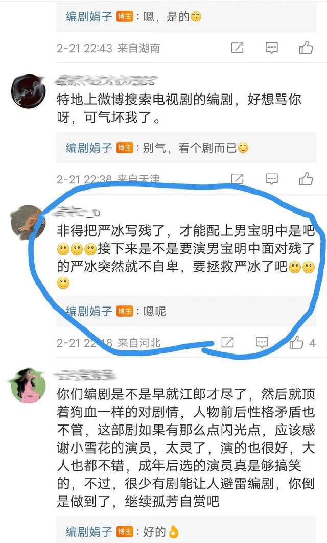 面对严冰剧情的问题,网友质问道,“非得把严冰写残了,才能配上男宝明中是吧,接下来是不是要演男宝明中面对残了的严冰突然就不自卑,要拯救严冰了吧。”