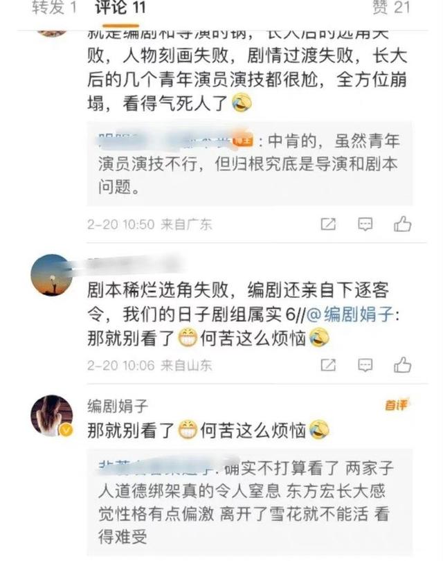 而有网友更是直言要弃剧,编剧娟子又说道“那就别看