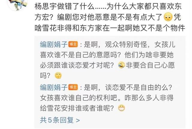 面对网友对雪花三角恋剧情的争议,编剧娟子又是反问网友“咋那么多人非得给雪花安排谁或者谁呢”。