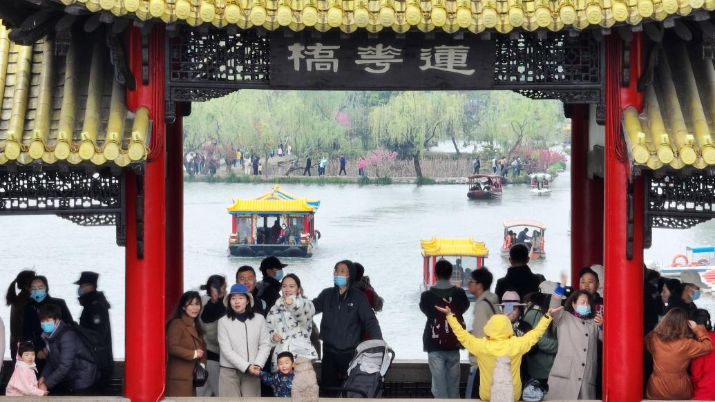 2023年4月5日,江苏扬州,游客在瘦西湖风景区玩耍。视觉中国图