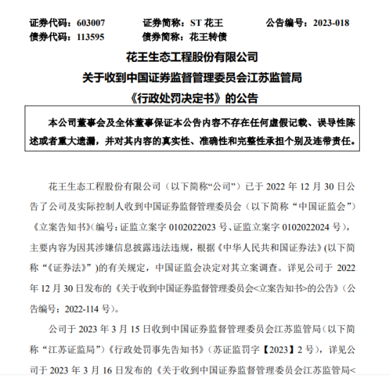 因而,江苏证监局决议对花王生态工程股份有限公司给予正告,并处以120万元罚款;对公司实践操控人肖国强给予正告,并处以150万元罚款;对时任董事长肖姣君给予正告,并处以60万元罚款;对时任财政总监林晓珺给予正告,并处以60万元罚款。
