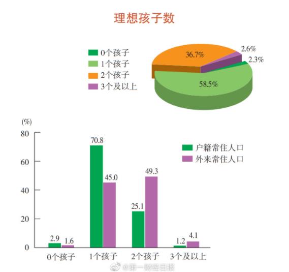 从理想孩子数来看,49.3%上海外来常住人口希望有两个孩子,70.8%上海户籍常住人希望有一个孩子。