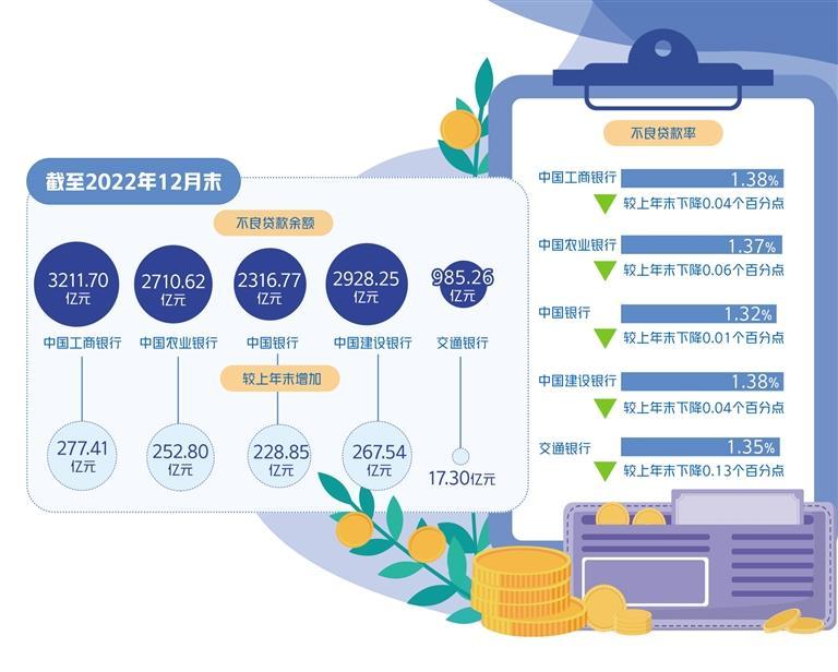 2022年年报闪现,上市银行的财物质量全体向好,部分银行的财物质量达到了近年来的最好水平。从五家国有大行的数据看,不良贷款余额、不良贷款率“一升一降”。到2022年12月末,中国工商银行、中国农业银行、中国银行、中国建造银行、交通银行的不良贷款余额别离为3211.70亿元、2710.62亿元、2316.77亿元、2928.25亿元、985.26亿元,较上年底别离添加277.41亿元、252.80亿元、228.85亿元、267.54亿元、17.30亿元;不良贷款率别离为1.38%、1.37%、1.32%、1.38%、1.35%,较上年底别离下降0.04个百分点、0.06个百分点、0.01个百分点、0.04个百分点、0.13个百分点。