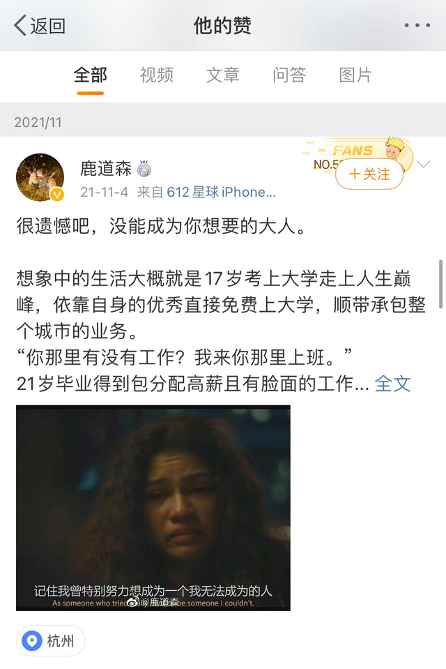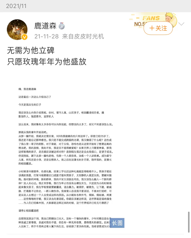 据刘学州微博显示,他曾点赞摄影师鹿道森的遗书“无需为他立碑,只愿玫瑰年年为他盛放 ”。鹿道森在遗书中称自己曾是山区留守儿童,原生家庭不幸,小时候因为长得像女孩子而遭遇了校园霸凌,留下了心理阴影,想“把生命交还给这个世界”。