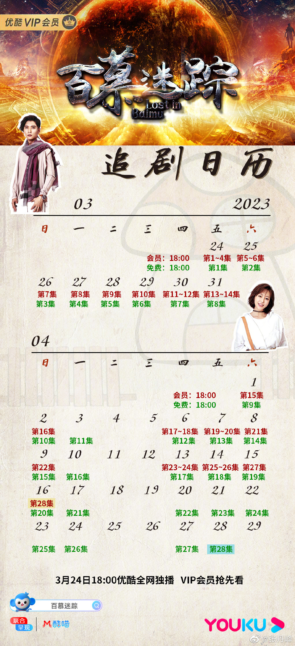 1、百慕迷踪更新时间什么时候播出:3月24日18:00优酷全网独播,VIP会员抢先看,首更4集,每周四至周六更新2集周日至周三更新1集;非VIP每天更新1集。