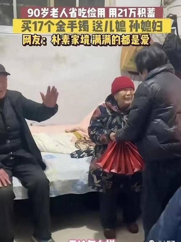 江苏徐州,两位九旬老人平日里省吃俭用攒下了一笔钱,然后花21万元买了17个金镯子,送给儿媳、孙媳和孙女当作新年礼物。