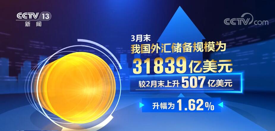 国家外汇管理局最新数据显现,3月末,我国外汇储备规划为31839亿美元,较2月末上升507亿美元,升幅为1.62%。