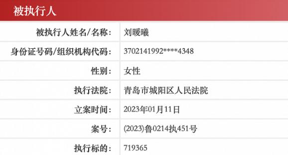 据中国执行信息公开网显示,刘暖曦(原名刘鑫)已成被执行人,执行标的71.94万元,立案时间为1月11日,执行法院为青岛市城阳区人民法院。1月11日晚,江歌妈妈江秋莲通过个人微博发声称,其诉刘暖曦案申请强制执行,目前通过审核已经立案。