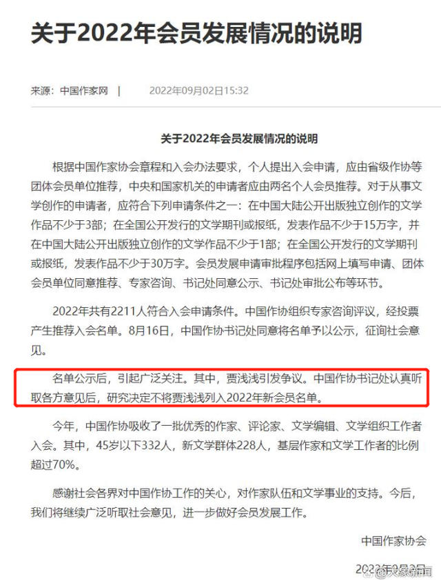 8月17日,中国作家协会公示2022年会员发展名单,拟发展会员994人,著名作家贾平凹的女儿贾浅浅的名字在其中。因其部分作品水平及履历引发争议,网友纷纷质疑中国作协的会员入选标准。9月2日,中国作家协会发布关于2022年会员发展情况的说明。中国作协书记处认真听取各方意见后,研究决定不将贾浅浅列入2022年新会员名单。