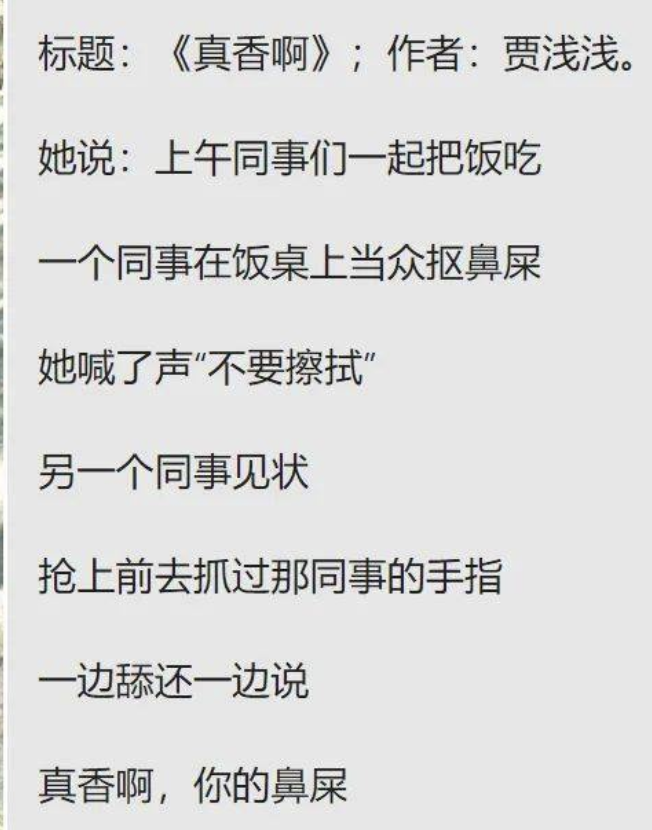 据大河报,贾浅浅的几首被指“屎尿屁”“回车体”的诗歌,遭到了一波又一波网友的嘲讽,甚至有网友开始了模仿创作,如网友“fang”:我/本来/不会作诗/因为学会用回车/所以/学会了/作诗。